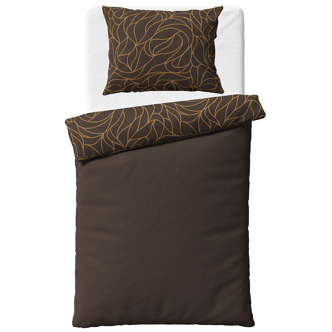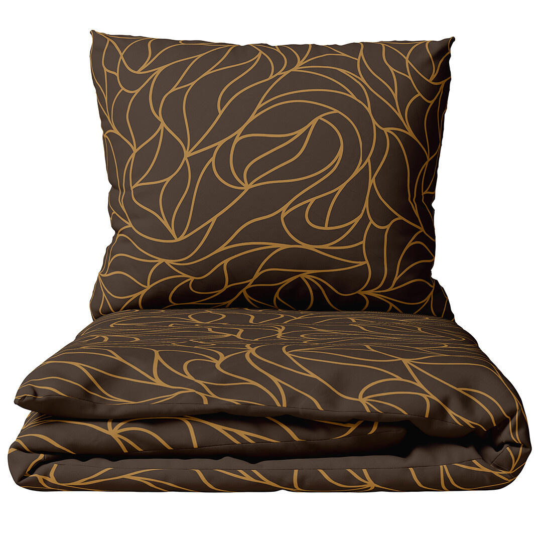 Design Dark Dream zaujme svým elegantním a vyváženým vzhledem. Lícní stranu zdobí jemný abstraktní motiv v hnědo-karamelových odstínech, který připomíná proplétající se linie a dodává látce hloubku a pohyb. Reverzní strana je jednobarevná v tmavě hnědém tónu, takže můžete snadno měnit atmosféru ložnice podle nálady, od výrazné elegance po klidný minimalismus. Polštář je laděn ve stejném stylu, z jedné strany s motivem, z druhé jednobarevný.