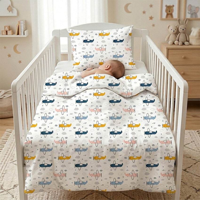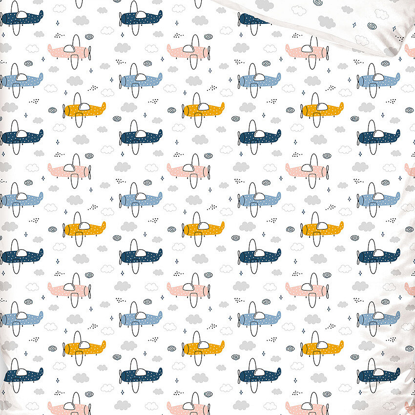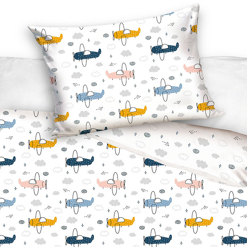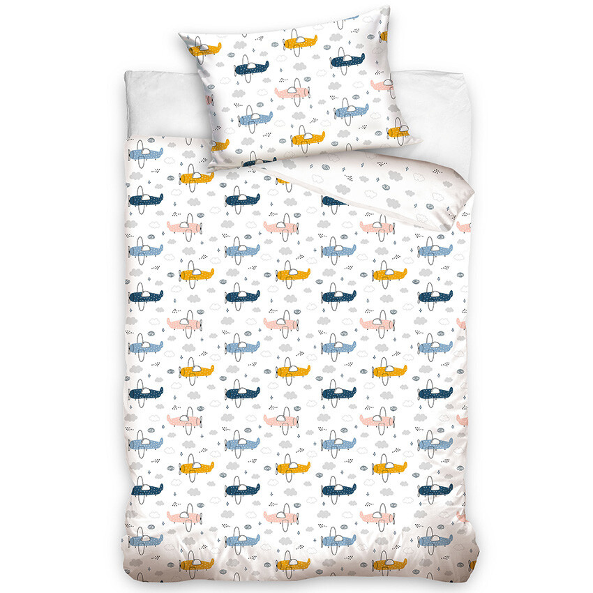 Lícová strana povlečení je zdobena jemným, hravým motivem barevných letadel rozletěných mezi drobnými obláčky. Ilustrace v pastelových odstínech modré, žluté, růžové a tmavě modré na světlém podkladu působí vzdušně, lehce a navozují klidnou atmosféru ideální pro dětský spánek. Kreslený styl je decentní, nadčasový a podporuje dětskou fantazii bez rušivých prvků.