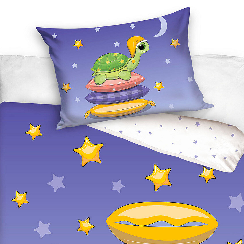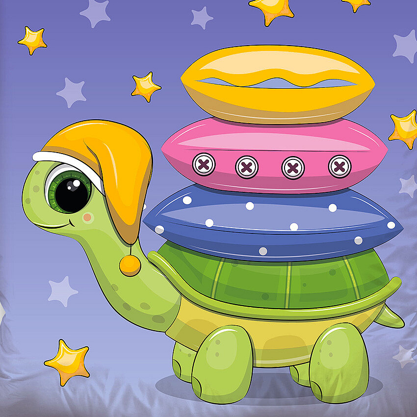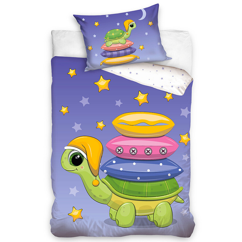 Přední strana přikrývky zaujme velkým motivem milé želvičky v noční čepičce, která si nese barevné polštářky a chystá se ke spánku. Ilustrace působí něžně a uklidňujícím dojmem, takže přirozeně navozuje večerní pohodu. Design je laděn do jemných fialových tónů inspirovaných noční oblohou, doplněných hvězdičkami ve žlutých a světle fialových odstínech. Barevné polštářky v růžové, modré a žluté dodávají motivu hravost a příjemné oživení.