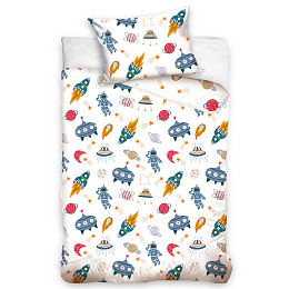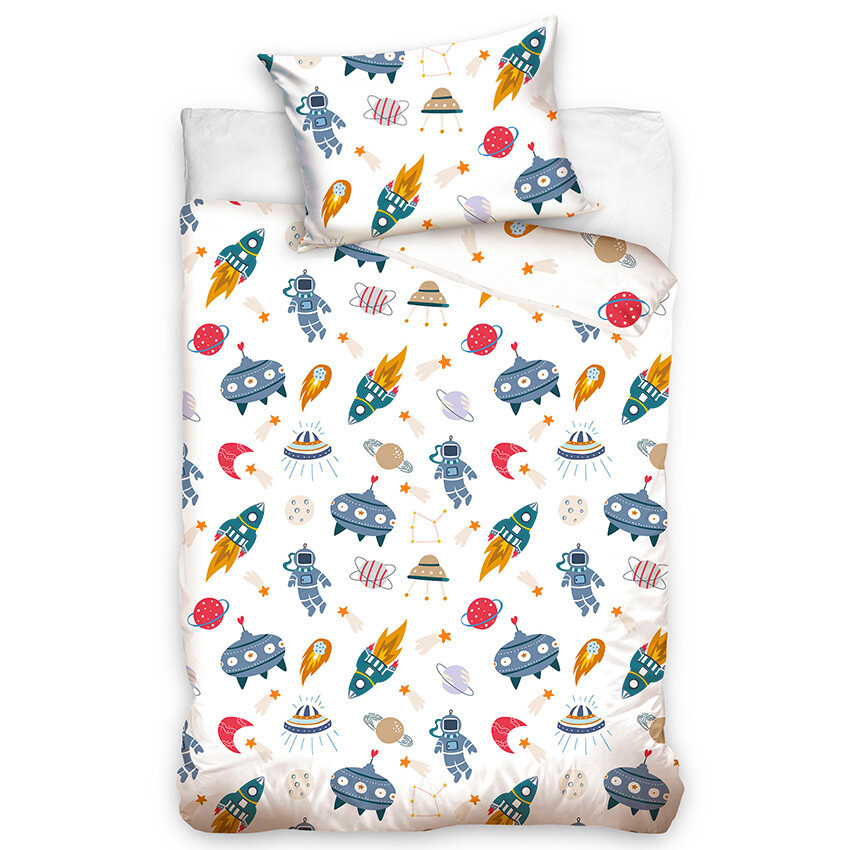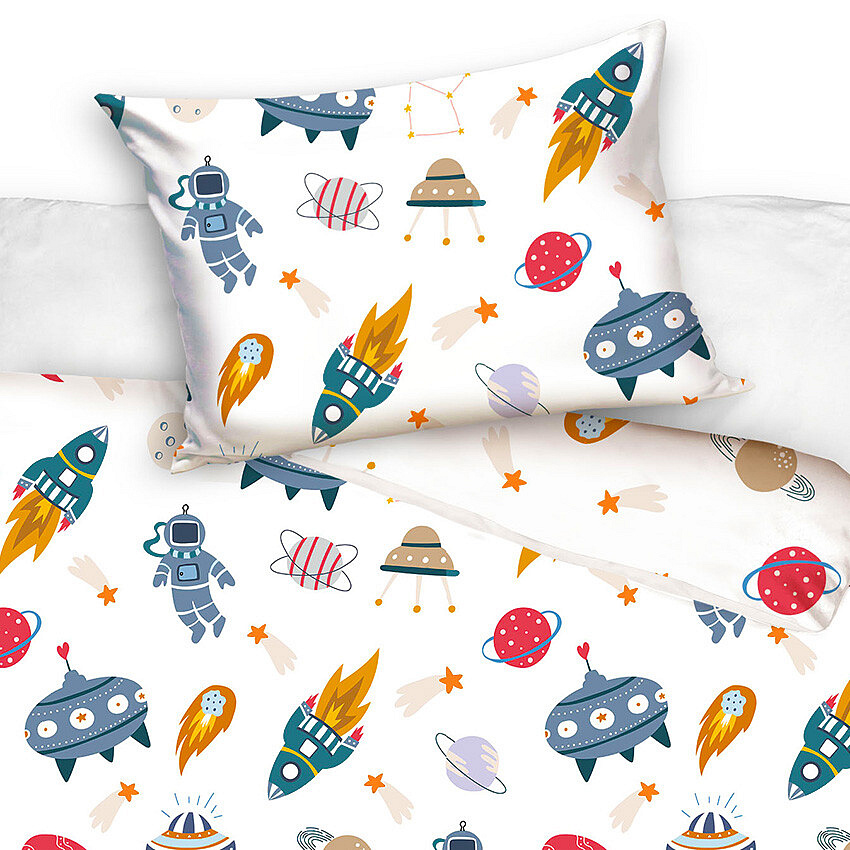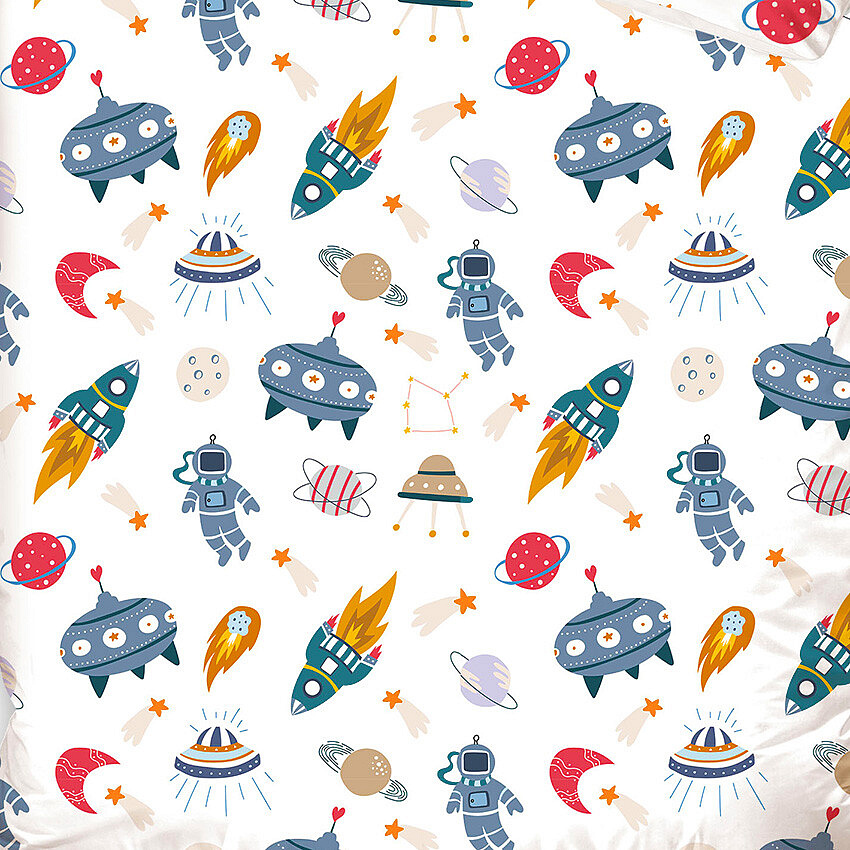 Povlečení zdobí hravý a detailně ilustrovaný vesmírný svět, ve kterém se prolínají rakety s plameny, astronauti ve skafandrech, planety s prstenci, komety i létající talíře. Motiv je rozložený na světlém podkladu, díky čemuž působí vzdušně a nepřehlceně. Barevná paleta kombinuje tmavě modrou a šedou s výraznými akcenty oranžové, červené, žluté a hořčicové, které dodávají vzoru energii a hravost.