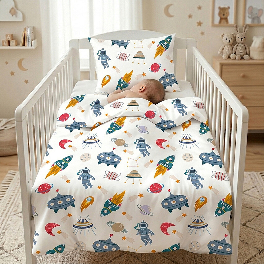 Lícová strana je bohatší na detaily a působí živě a dobrodružně, zatímco rubová strana nabízí stejný vesmírný motiv v klidnějším, vzdušnějším rozložení. Díky tomu lze povlečení snadno otočit a přizpůsobit vzhled postýlky aktuální náladě – jednou výrazné dobrodružství, podruhé jemnější varianta pro klidné usínání. Vzor podporuje dětskou fantazii, zvídavost a promění každé spaní v malou vesmírnou misi.