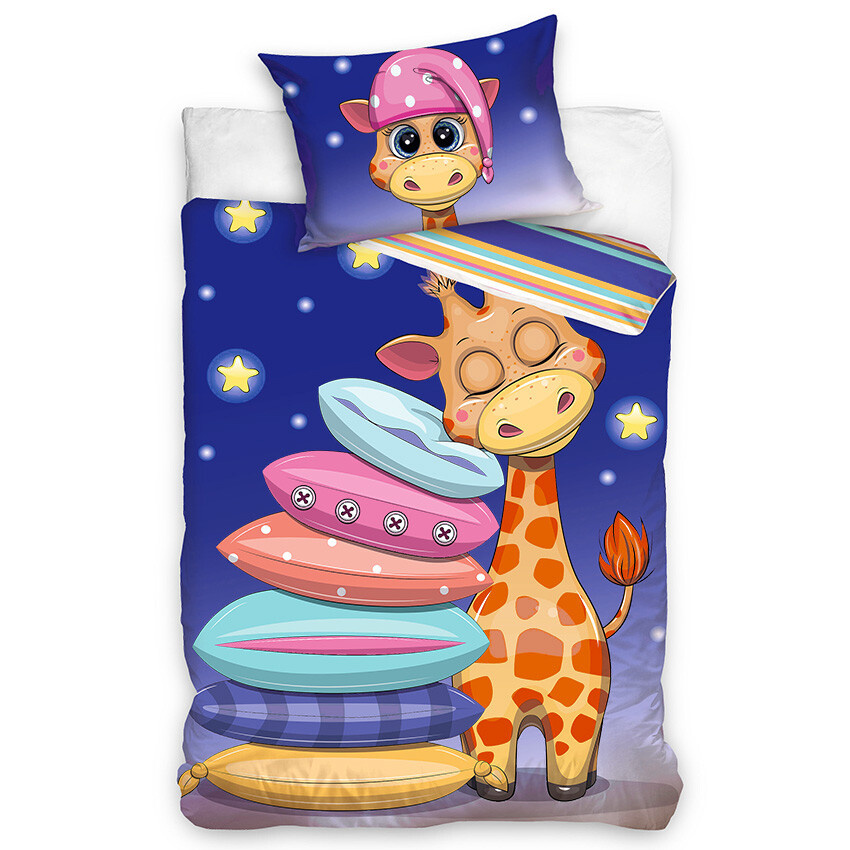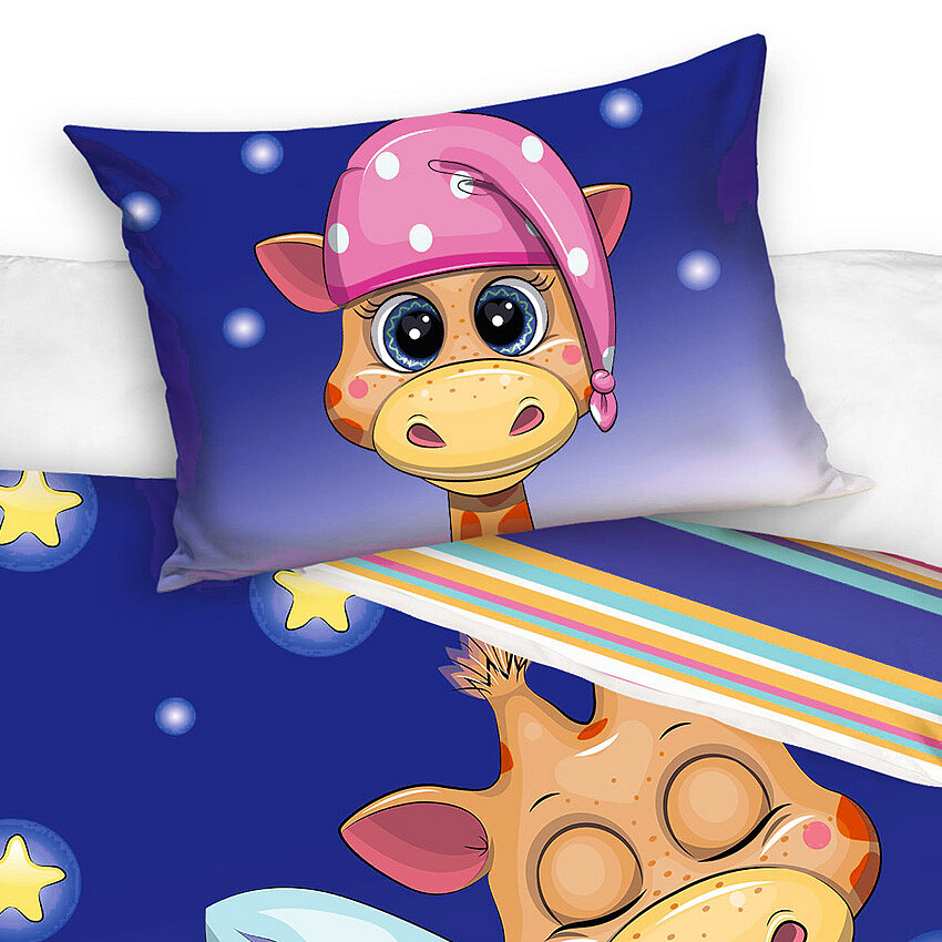 Přední strana přikrývky zaujme velkým motivem spící žirafky s přátelským výrazem, která se opírá o hromádku měkkých polštářků v pastelových tónech růžové, tyrkysové, modré a žluté. Fialové pozadí s hvězdičkami a drobnými světelnými body evokuje kouzelnou večerní atmosféru a podporuje klidné usínání. Zadní strana přikrývky je řešena výraznějším pruhovaným vzorem v harmonické kombinaci fialové, růžové, tyrkysové, žluté a bílé, který dodává celému setu veselý a moderní kontrast.