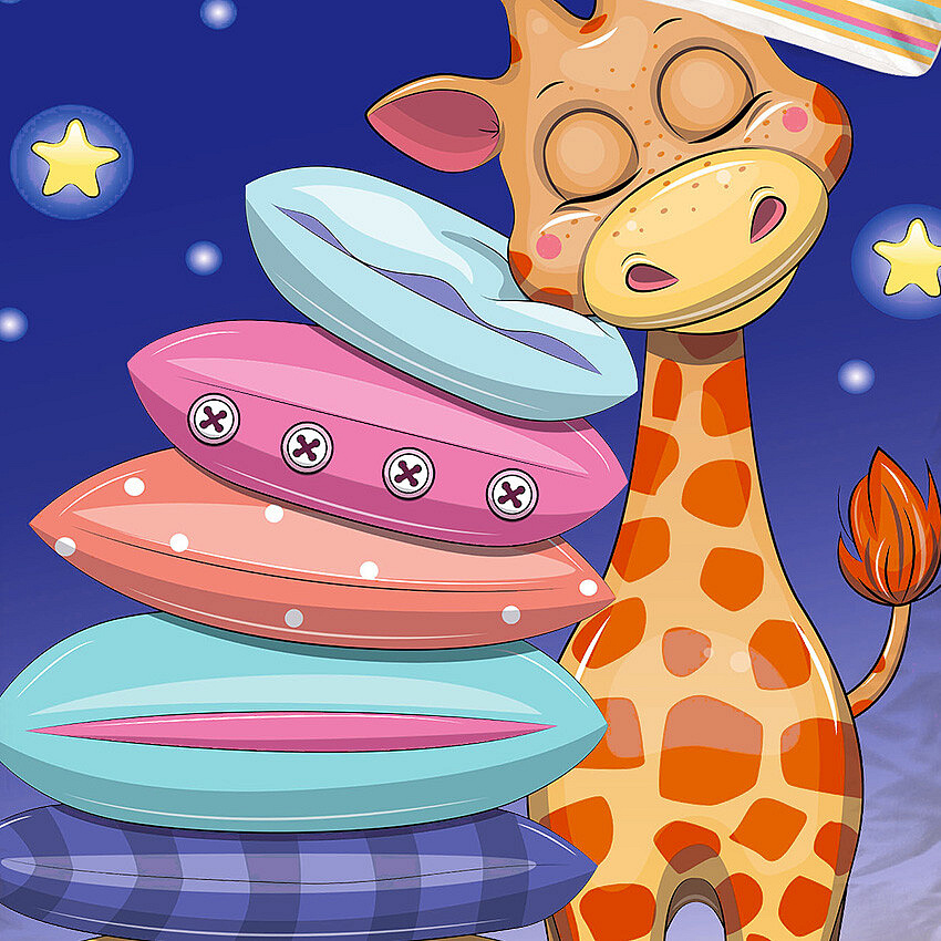 Polštář zdobí roztomilá žirafka s velkýma očima a noční čepičkou, která působí něžně a uklidňujícím dojmem. Motiv je zasazen do fialového podkladu připomínajícího noční oblohu, doplněného jemnými světelnými tečkami. Teplé odstíny žluté, hnědé a růžové dodávají ilustraci hřejivý charakter. Zadní strana polštáře přináší barevné vodorovné pruhy ve fialové, růžové, tyrkysové, žluté a bílé, které působí hravě a umožňují snadno obměnit vzhled postýlky.