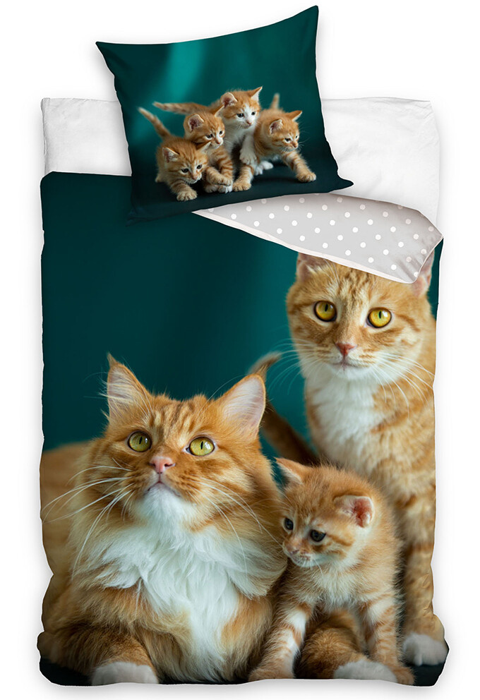 Ložní povlečení Kočičí Rodinka, je vyrobeno ze 100% hladké bavlny v kvalitě Renforcé a je oboustranné. Rozměr tohoto povlečení je 140x200/ 70x90 cm, pro lepší povlékání je opatřeno zipovým zapínáním. Na lícní straně povlaku přikrývky je roztomilá, kočičí rodinka. Rezavé kočky mají dle lidí charakter dvojí tváře. Většinou jsou zrzavé kočičky velmi mazlivé a sympatické, mají rády lidi a hlasitě vrní. Jsou empatické k bolístkám lidí a lehnou si vždy na nemocné místo, nebo nám aspoň dělají společnost. Zrzka může být ale někdy také pěkná potvůrka a nenechat si nic líbit. Reverzní strana povlaku přikrývky je šedá a jsou na ní bílé puntíky. Povlak polštáře je z obou stran stejný, s další várkou rezavých koťátek Vhodnou barvou prostěradel bude šedá a smaragdově zelená. Bavlněné povlečení Kočičí Rodinka je upraveno Sanforizací, která zaručuje rozměrovou stálost. Všechna naše povlečení jsou opatřena certifikátem Oeko-Tex Standard 100.