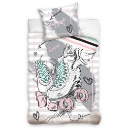 Ložní povlečení Kolečkové brusle Roller Dance, je vyrobené z kvalitní 100% hladké bavlny renforce. Bavlněné povlečení je oboustranné. Určitě všichni dobře znáte čtyř kolečkové brusle, které se staly velkým retro hitem poslední doby. Nejen že se v nich bruslí kolem pláží, v parcích, ale také pod stříbrnou "disco koulí", na staré hudební hity. Na lícní straně povlaku přikrývky jedny takové brusle máme, s barevnými tkaničkami, Kolem úžasných Rollerek, které vynikají na pruhovaném podkladu šedé barvy. Reverzní strana povlaku přikrývky je také pruhovaná a pruhy se střídají vodorovně v barvách růžové, zelenkavé, černé a bílé. Povlak polštáře je z obou stran stejný, také s šedými vodorovnými pruhy a nápisem love. v růžové barvě, který vyniká na šedivém podkladu. Povlečení doporučujeme prát z rubové strany, se zapnutým zipovým uzávěrem. Důležité je odstřeďováním při nižších otáčkách, aby nedošlo k nezvratnému poškození bavlněných vláken. Nepoužívejte proto prací prostředky s obsahem rozjasňujících a bělících substancí. Prací symboly jsou uvedeny na obale. Odstíny barev obrázků se mohou lehce lišit v závislosti na nastavení vašeho monitoru. Vhodnou barvou prostěradel bude růžová a bílá.