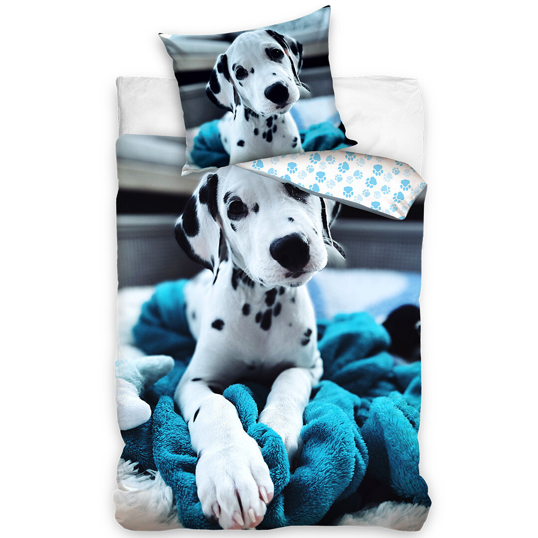 Na lícní straně přikrývky je zachycen roztomilý dalmatin, který odpočívá na měkké modré dece. Jeho hebká srst s typickými černými flíčky a laskavý pohled působí tak realisticky, že máte chuť ho pohladit. Tento detailní a klidný motiv přináší do pokoje příjemné teplo domova a dodává posteli roztomilý, mazlivý vzhled.