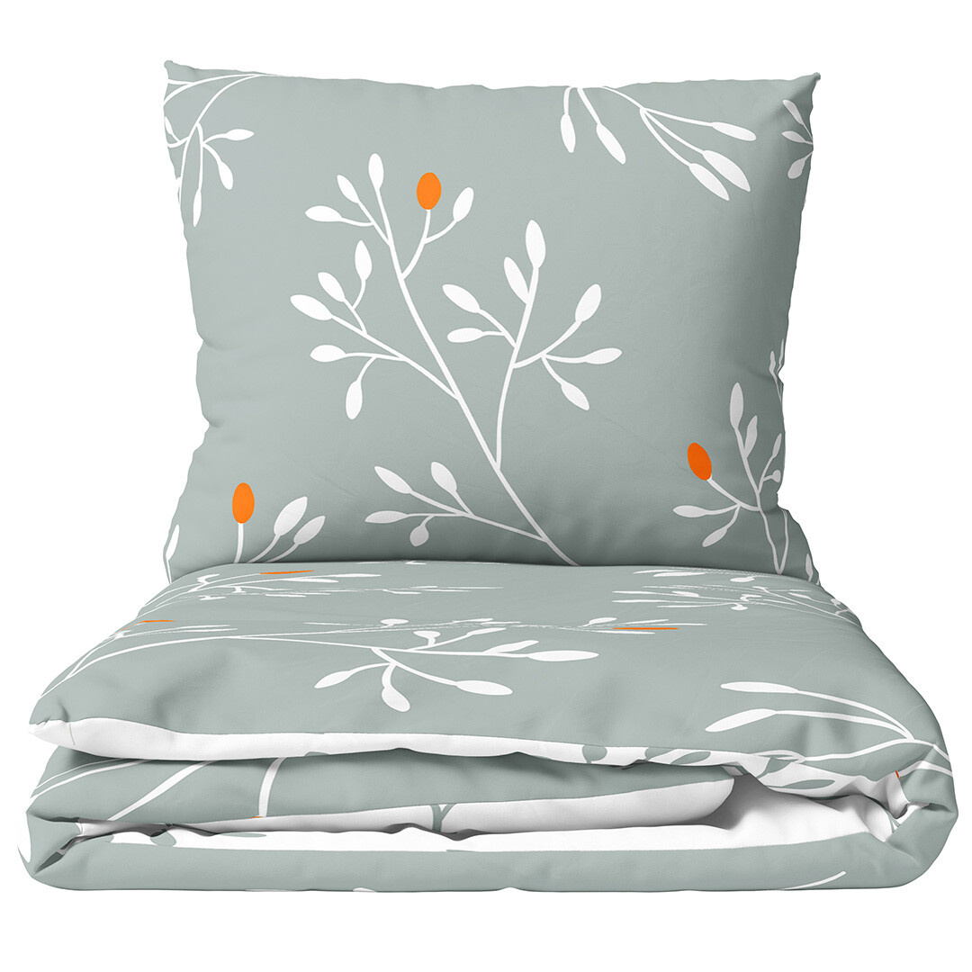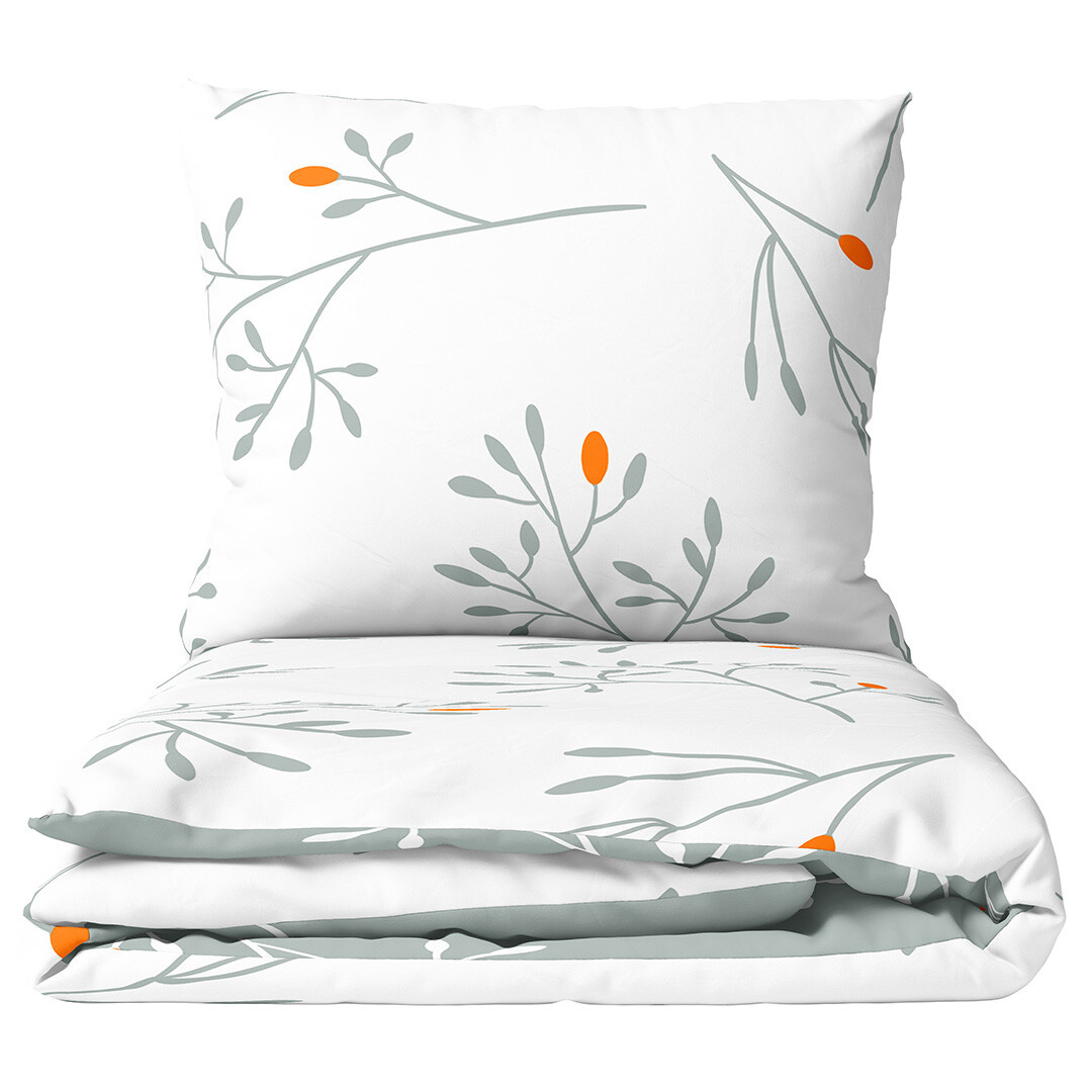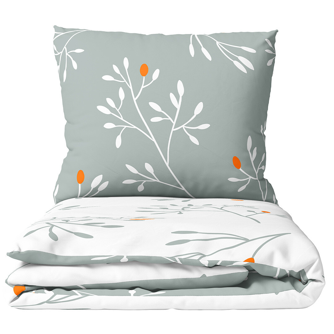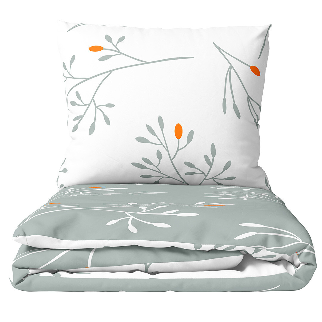 Design povlečení Winter Šedé je inspirován zimní přírodou a nese v sobě jemnost i klid. Na elegantním šedém podkladu se rozprostírají bílé větvičky s drobnými oranžovými plody, které připomínají zmrzlé bobule v ranním mrazu. Motiv je vyvážený, decentní a přitom dostatečně výrazný, aby v ložnici působil stylově a hřejivě. Obrácená strana povlečení přináší světlý tón s obráceným vzorem, což umožňuje měnit vzhled postele podle nálady – od jemně kontrastního po klidně neutrální. Povlak na polštář je laděn ve stejném duchu a společně s přikrývkou vytváří harmonický celek, který dodá ložnici útulnou atmosféru. Kombinace šedých, bílých a jemně oranžových odstínů působí vyváženě a přirozeně, díky čemuž se povlečení hodí do moderních i klasických interiérů.