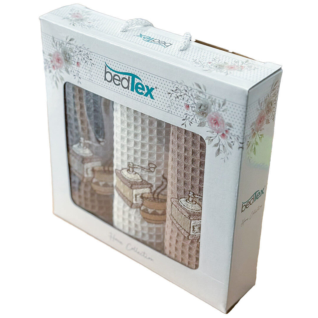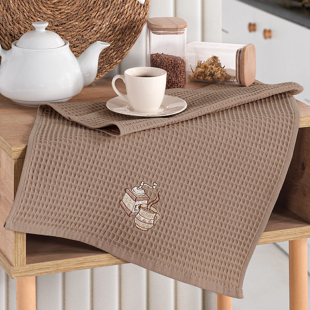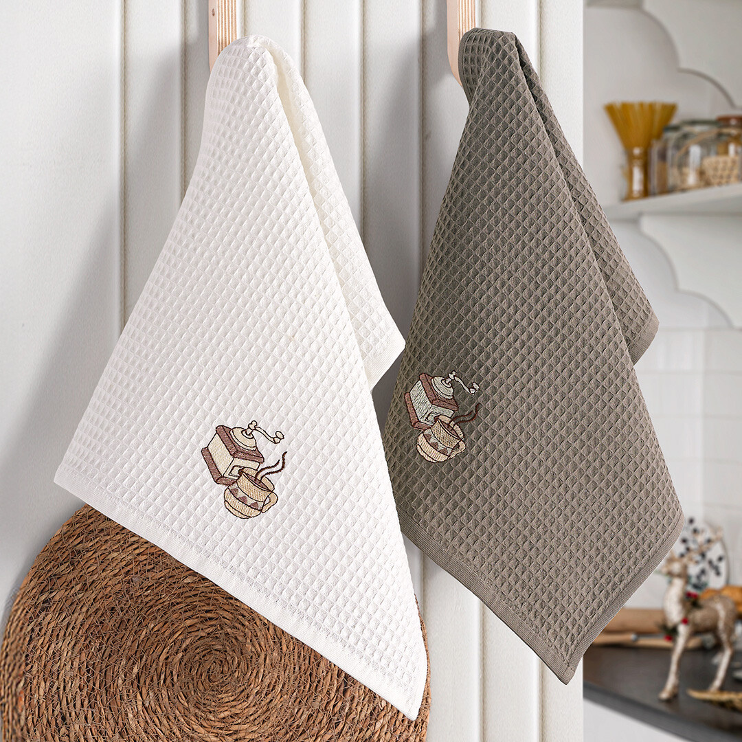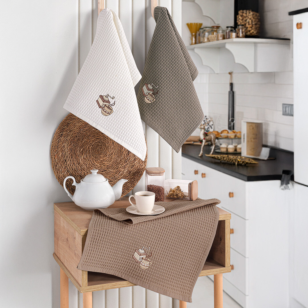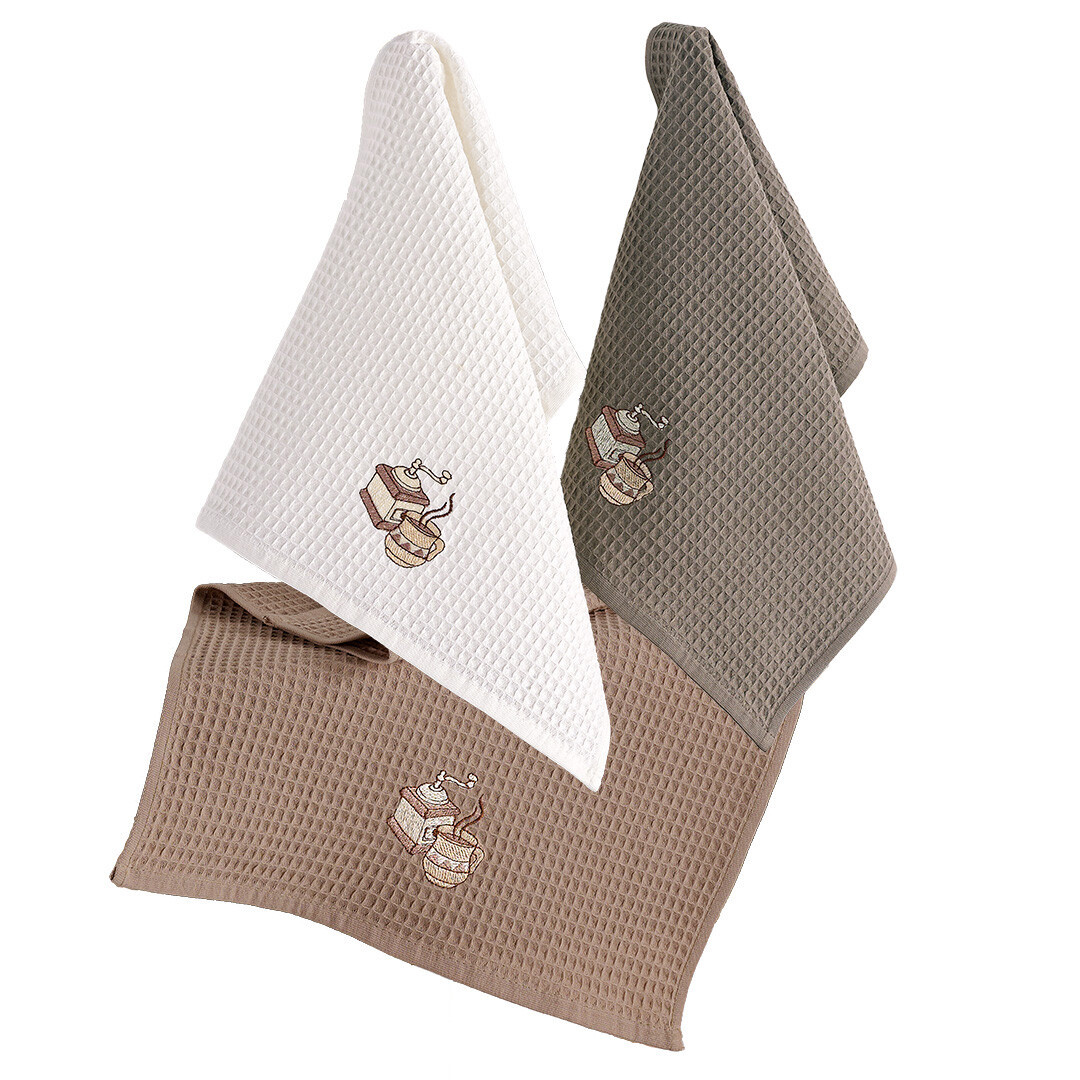 Ať už jste doma v kuchyni, nebo vlastníte kavárnu, vězte, že tato sada vaflových utěrek se vzorem kávomlýnku, je pro Vás jako stvořená. Sada tří vaflových utěrek, v krásném dárkovém balení je ve třech barvách, a to světle hnědé, béžové a bílé. Vaflový vzor je textilie s plastickým povrchem, kdy hustě tkaná místa tvoří ve tkanině prohloubeniny. Vyšitý kávomlýnek společně s hrnkem teplé kávy doslova láká milovníky kávy, si hned jednu umlít a uvařit. Rozměry každé utěrky jsou 30x50 cm. Nejen že budou krásně ve Vašich kuchyních vynikat, ale zároveň splní svůj účel, pro který byly vyrobeny :)) Tato dárková sada je novinkou v naší nabídce a pochází z kolekce Exclusive Home Collection. Sadu vaflových utěrek vhodně doplníte froté ručníčky v přírodních barvách, které spolu s dalšími rozmanitými vzory najdete v naší nabídce. Utěrky jsou vyrobeny ze 100% bavlny.