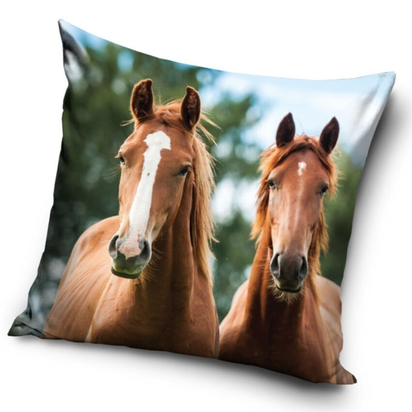 Dekorační polštářek Koně Hnědáci, má rozměr 40x40 cm a je vyrobený z měkkého a hladkého veluru s gramáží 190 g/m². Tento dekorační polštářek s nádherným realistickým motivem dvou hnědých koní přináší kousek přírody přímo do vašeho domova. Dva hnědáci stojí bok po boku na zelené louce a jejich klidný pohled působí velmi harmonicky a uklidňujícím dojmem. Díky příjemnému povrchu a pečlivému zpracování zpříjemní každý odpočinek a zútulní váš interiér. Materiál, ze kterého je tento polštářek vyroben se vyznačuje svým krátkým a hladkým chloupkem, který připomíná samet. Výplň polštáře tvoří netkaná textilie, kterou lze díky zipového zapínání vyjmout. V naší nabídce najdete také další polštářky, povlečení, deky, ručníky a osušky s krásnými motivy zvířátek.