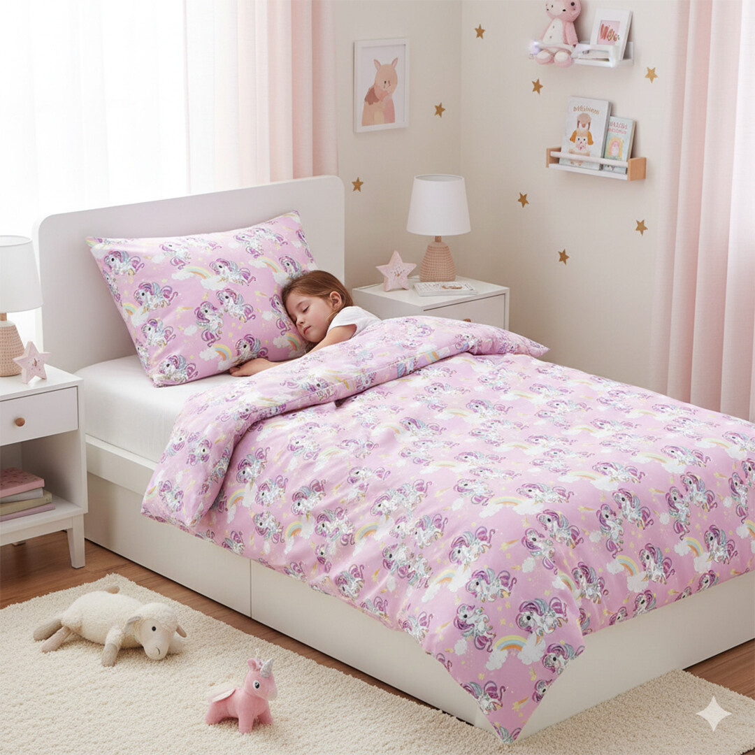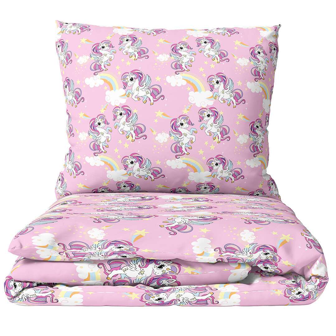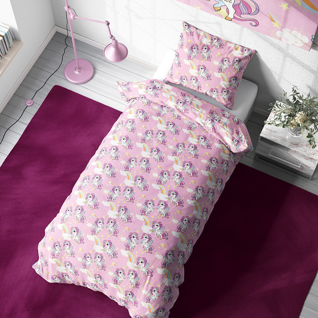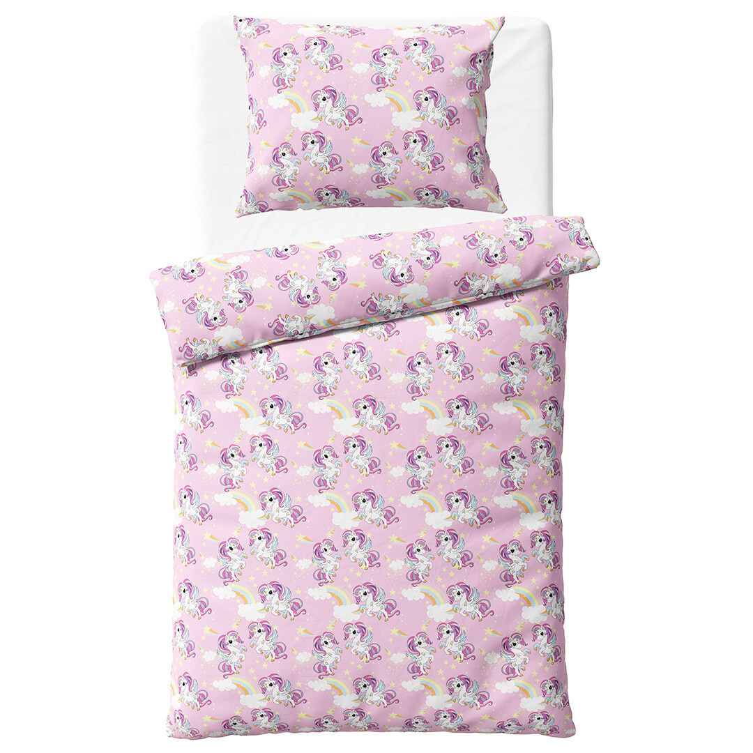 Povlečení působí jako kouzelná pohádka vyprávěná na látce. Základ tvoří jemný růžový podklad, který působí něžně a uklidňujícím dojmem. Na něm se rozprostírají roztomilí bílí jednorožci s duhově zbarvenými hřívami a ocásky, každý z nich je jinak natočený, takže celý motiv působí živě a hravě, jako by jednorožci právě poskakovali po obloze. Mezi nimi se vznášejí barevné duhy, které propojují jednotlivé motivy a vytvářejí harmonický celek. Hvězdičky v jemných pastelových odstínech dodávají látce snový efekt a připomínají noční oblohu plnou kouzel. Obláčky v bílých a světle modrých tónech přinášejí pocit lehkosti a jemnosti, takže se dítě při usínání bude cítit jako v pohádkovém snu.