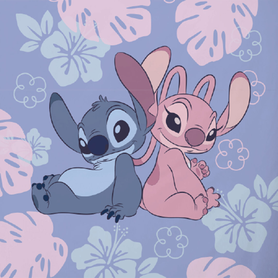 Lícní strana přikrývky zobrazuje Stitche a Angel, jak sedí zády k sobě a usmívají se v přátelském duchu. Pastelové odstíny fialové, růžové a modré v kombinaci s tropickými květy ibišku vytvářejí klidný, letní vzhled, který připomíná dovolenou u moře. Celý motiv působí jemně, pozitivně a snově, takže dětský pokoj rozjasní a zútulní.