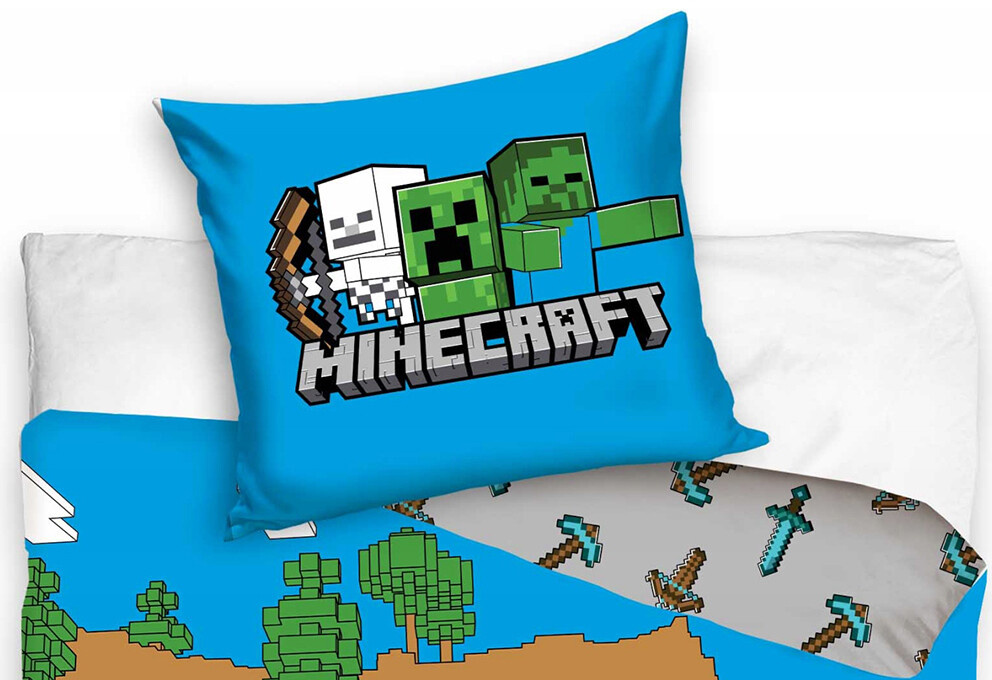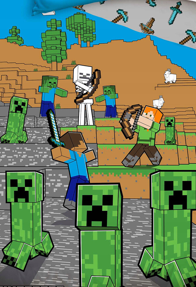 Dětské povlečení Minecraft Time to Mine, je oboustranné, vyrobené ze 100% hladké bavlny renforce. Rozměry povlečení jsou 140x200/ 70x90 cm. Bavlněné povlečení Minecraft Time to Mine je pro snadnější povlékání opatřeno zipovými uzávěry. Na lícní straně povlaku přikrývky jsou Minecraft postavičky, jak ty dobré, tak ty zlé. Vidíme zde velký souboj hrdinů Minecraftu s creepery se zombíky. Rubová strana je šedá s obrázky malých mečů, krumpáčů a luků. Povlak polštáře je také oboustranný, lícní strana je modrá a na ni jsou tři postavičky, rubová strana je stejná jako rub přikrývky. Vhodné prostěradla k tomuto povlečení budou v modré, zelené, hnědé, béžové a šedé barvě.