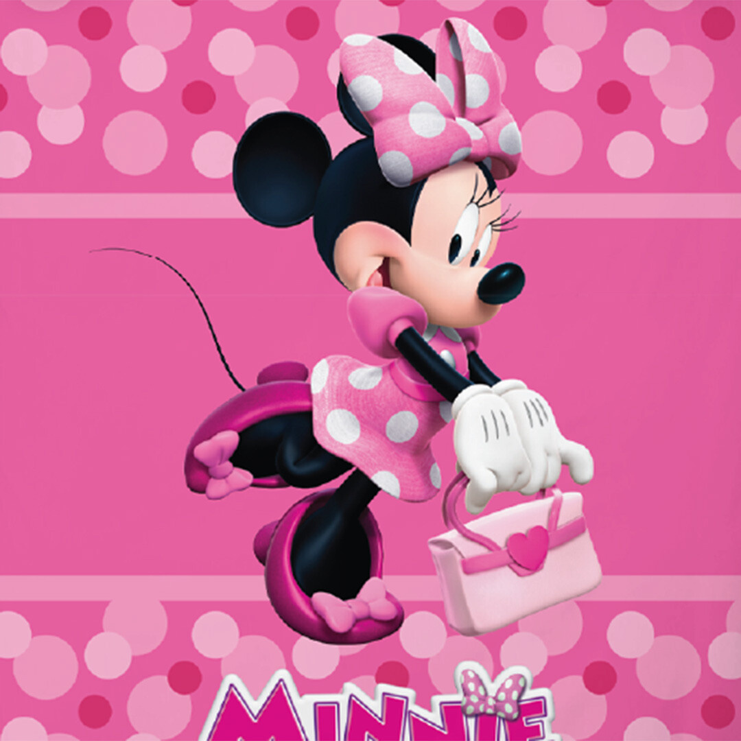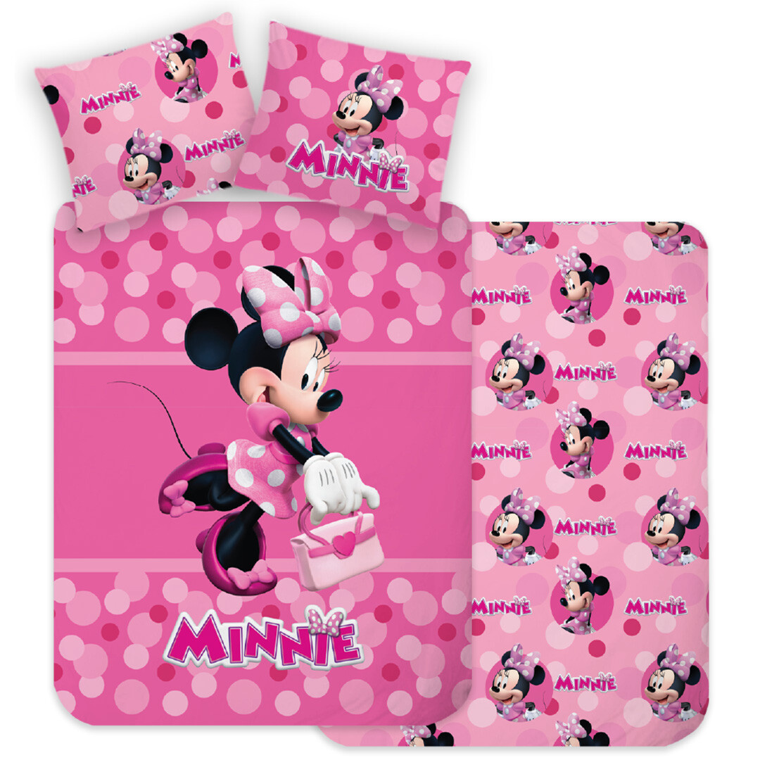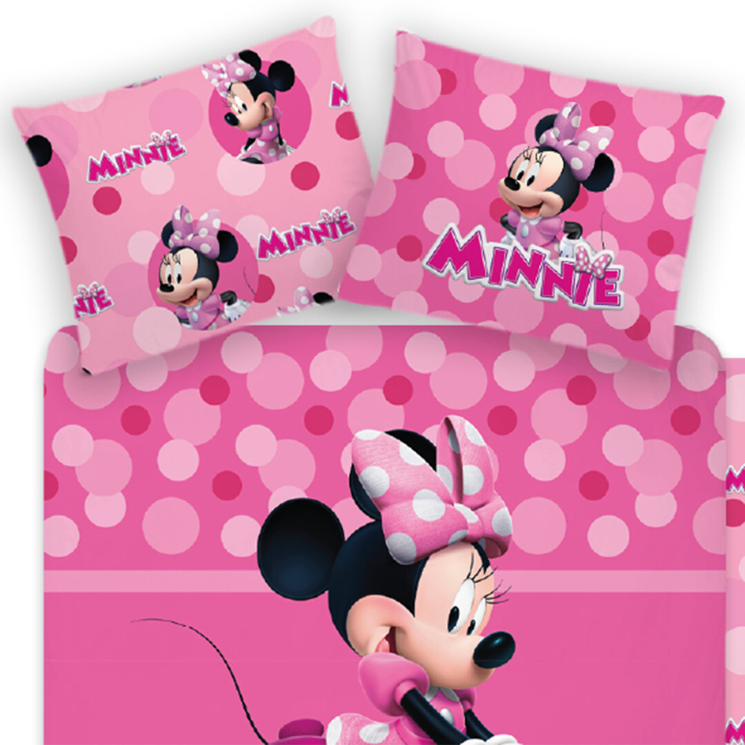 Povlak na polštář je z obou stran stejný a krásně ladí s přikrývkou. Zdobí ho usměvavá Minnie v jejích růžových puntíkovaných šatech s velkou mašlí, doplněná o nápis MINNIE a decentní srdíčkové motivy. Růžové pozadí s puntíky v různých odstínech dotváří roztomilý a sladěný vzhled celého setu.