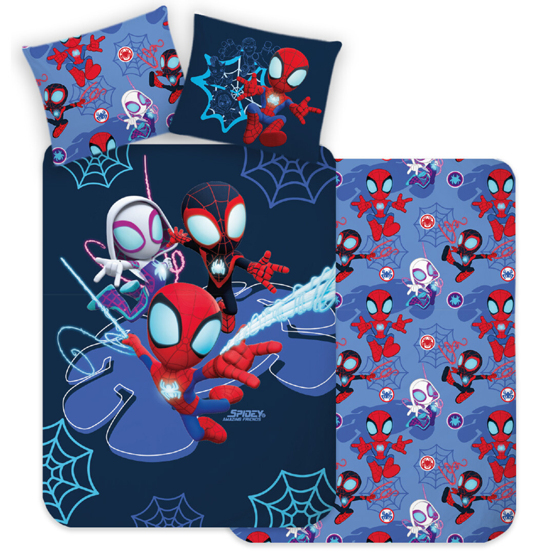 Lícní strana přikrývky zaujme realistickým a barevně výrazným motivem oblíbených hrdinů. V popředí je Spidey v typickém červeno-modrém obleku, jak vystřeluje pavučinu do akce. V pozadí nechybí jeho přátelé Ghost-Spider a Miles Morales, připraveni čelit dalším výzvám. Tmavě modré pozadí s pavoučími sítěmi dodává motivu napětí a dynamiku, díky čemuž obrázek působí jako živý komiksový moment.