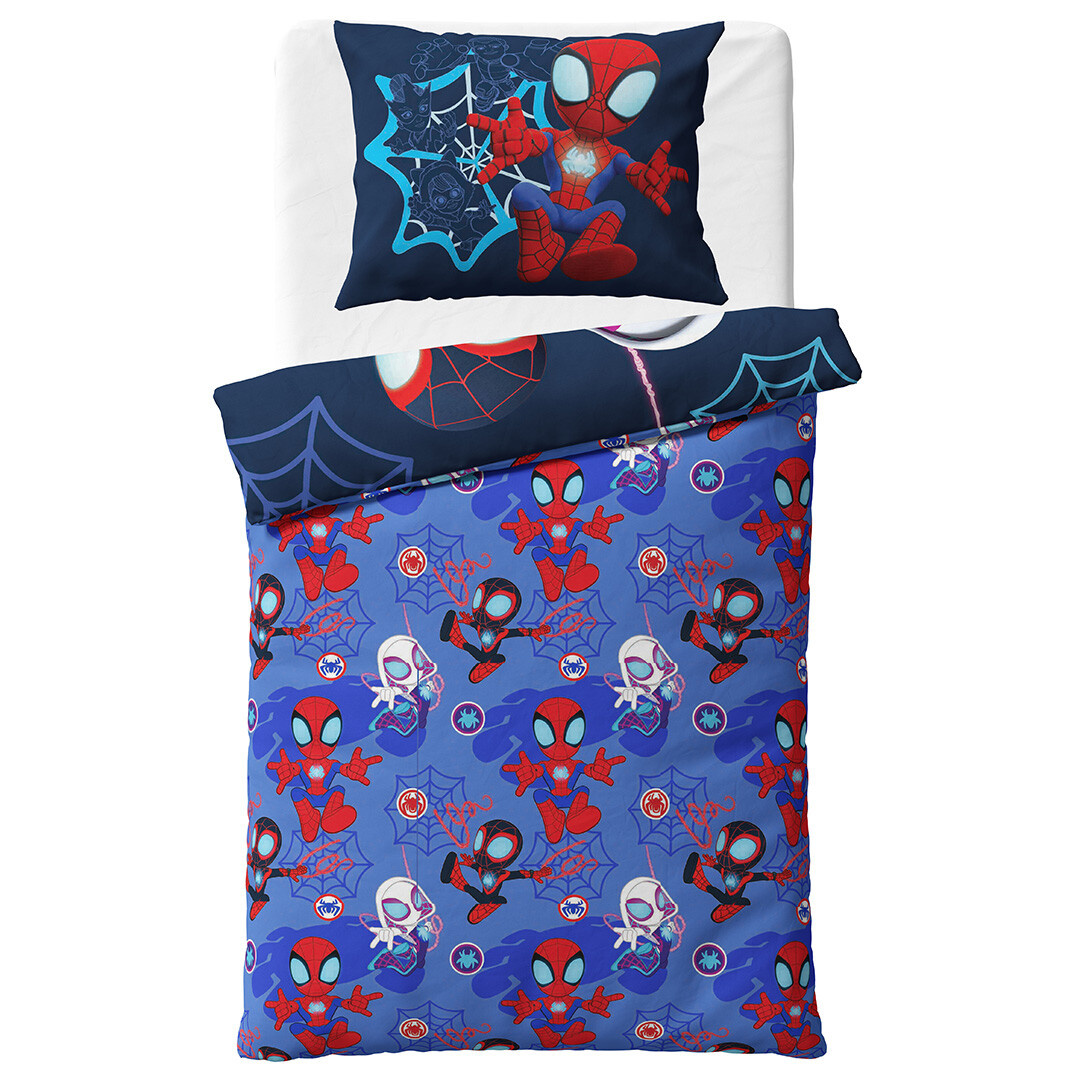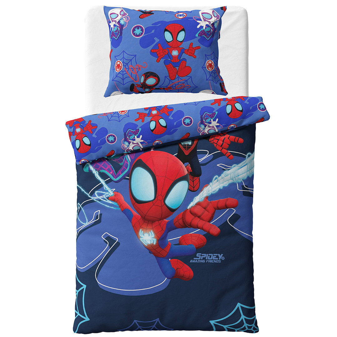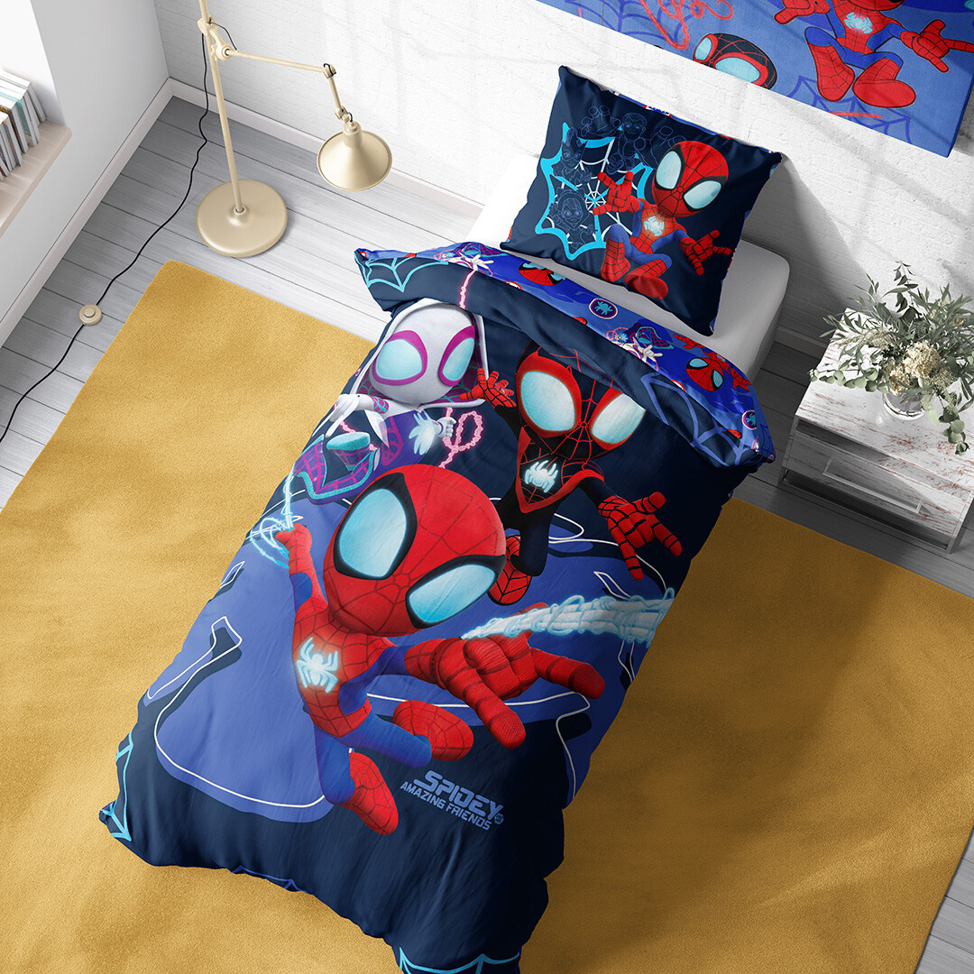 Dětské povlečení Spidey Pavoučí dobrodružství přenese malé fanoušky přímo do světa Marvelu, kde Spidey, Ghost-Spider a Miles Morales chrání město před padouchy a dokazují, že každý může být hrdinou. Vyrobeno ze 100% bavlny renforcé, která je měkká, prodyšná a příjemná na dotek. Povlečení má praktické zipové zapínání a pyšní se certifikátem Oeko-Tex Standard 100, který zaručuje, že neobsahuje žádné škodlivé látky. Rozměry povlečení jsou 140 × 200 cm a 70 × 90 cm.