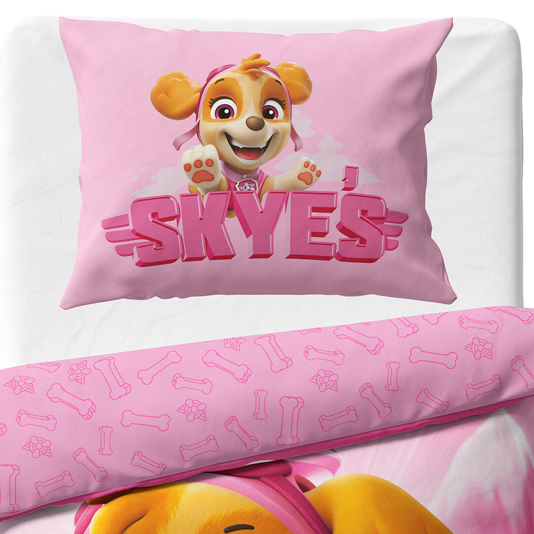 Povlak na polštář zobrazuje usměvavou Skye, která mává tlapkou a zve malé snílky na dobrodružnou leteckou výpravu. Pod ní je výrazný nápis SKYE’S doplněný o drobná křidélka, která krásně podtrhují její charakter odvážné pilotky.