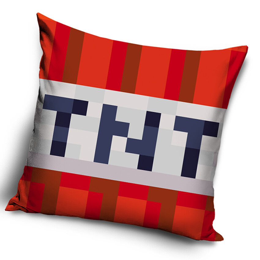 Motiv polštářku vychází z ikonického TNT bloku ze světa Minecraftu, který patří mezi nejznámější herní prvky. Vzor tvoří výrazná pixelová kostka s typickým nápisem TNT, laděná do sytých červených, oranžových a bílých odstínů. Kontrastní barevné pruhy a čisté grafické zpracování připomínají herní exploze a akční momenty, které jsou s Minecraftem úzce spojené. Celý design působí moderně, herně a je ideální pro děti, které mají rády jednoduché, ale výrazné Minecraft motivy.