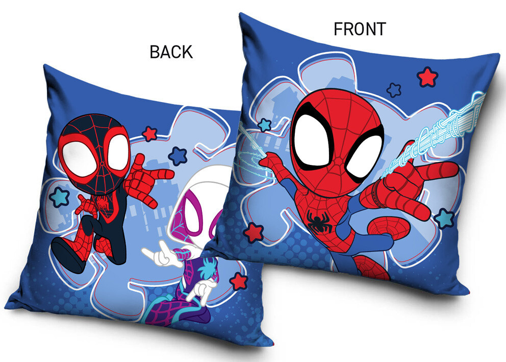 Vzhled polštářku je inspirován populárním animovaným seriálem Spidey a jeho úžasní přátelé a nabízí oboustranný design s rozdílnými motivy. Jedna strana patří hlavnímu hrdinovi Spideymu, který je vyobrazen v pohybu během superhrdinské akce s pavučinou. Druhá strana představuje jeho týmové parťáky Spina (Miles Morales) a Ghost-Spider (Gwen Stacy), kteří společně doplňují svět mladých hrdinů.