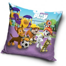 Na obou stranách polštářku je identický, energický motiv oblíbených hrdinů ze seriálu Paw Patrol. Chase, Rubble a Marshall si užívají aktivní den na hřišti plném prolézaček a zábavných atrakcí. Chase hraje fotbal, Rubble se chystá vyrazit na skateboard a Marshall předvádí svou akční jízdu – přesně tak, jak děti své čtyřnohé hrdiny milují.