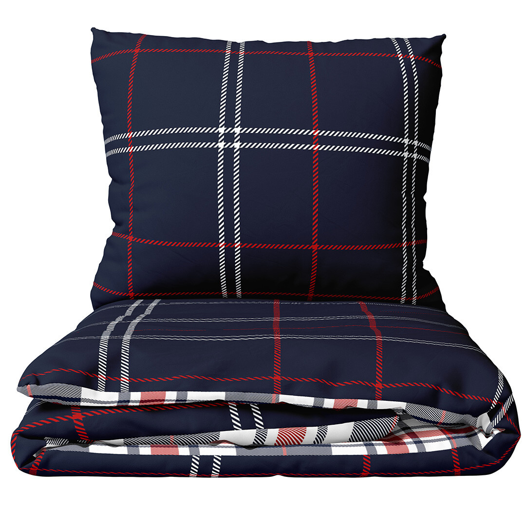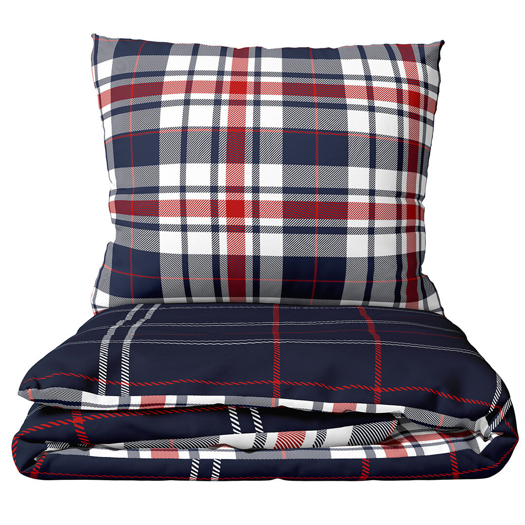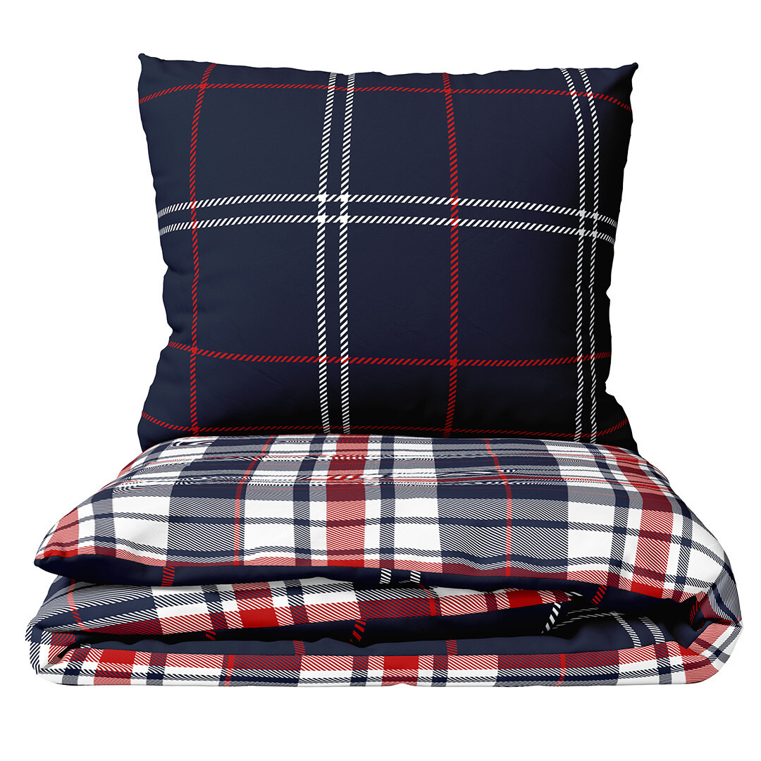 Povlečení je oboustranné, jedna strana nabízí klasické káro v tmavě modrém tónu protkávaném jemnými červenými a bílými liniemi, zatímco druhá působí světleji, s hustším a jemnějším prokládáním barev. Tento oboustranný design vám umožní jednoduše měnit vzhled ložnice podle nálady či ročního období.