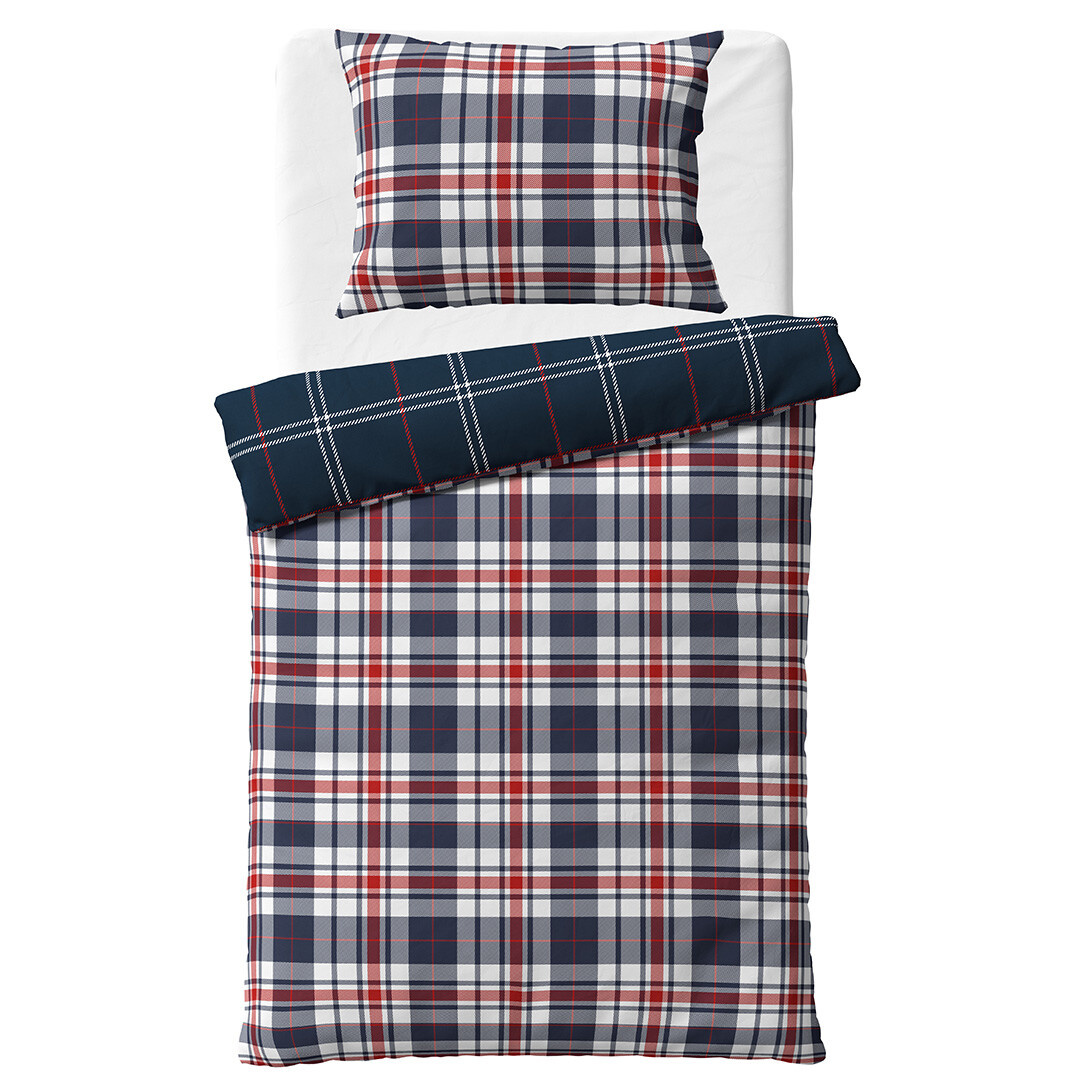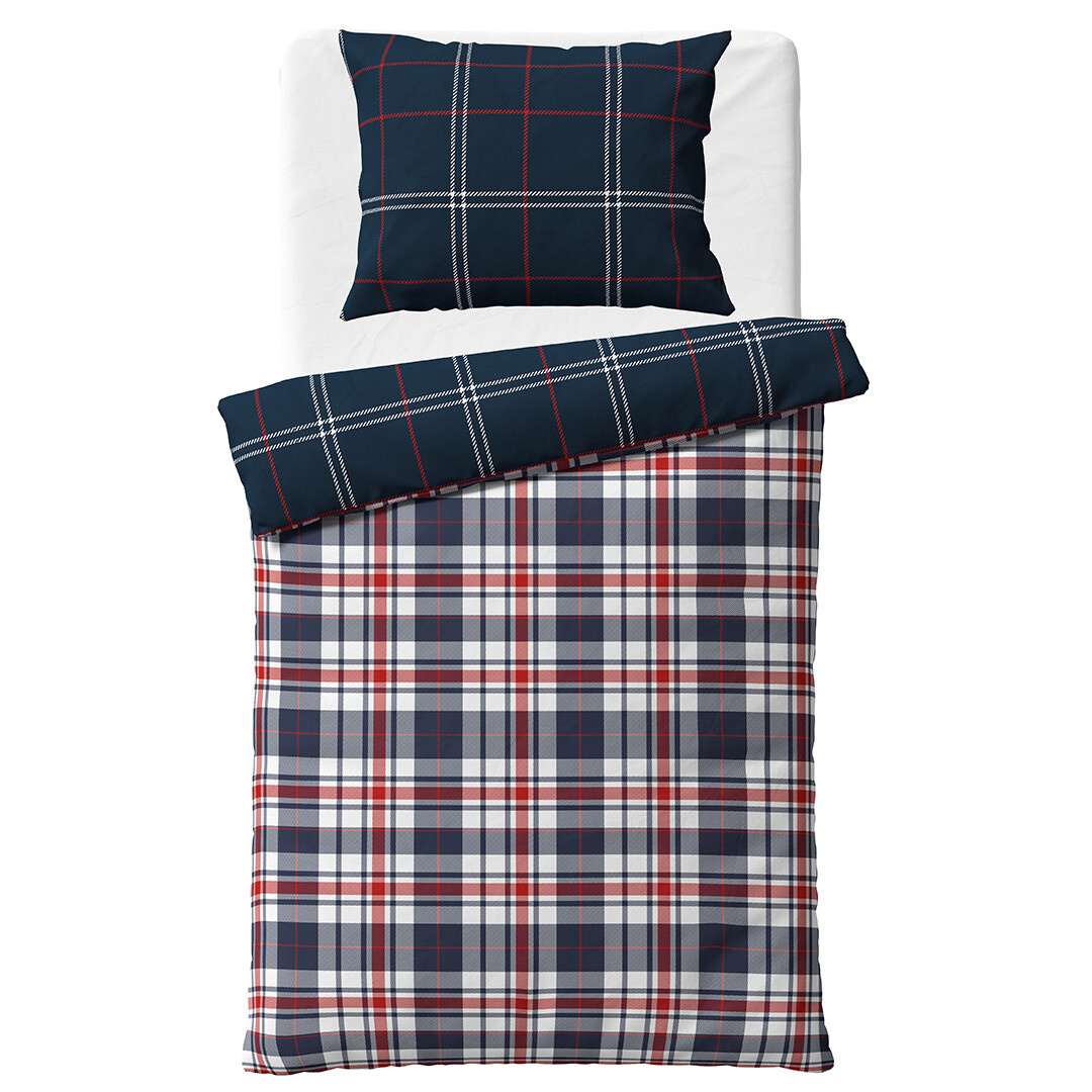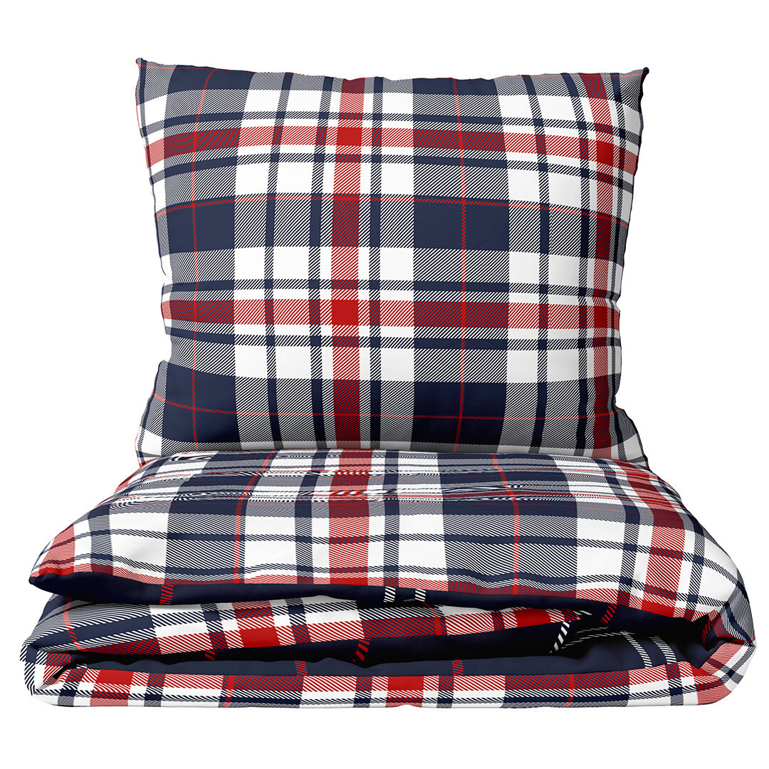 Povlečení je oboustranné, jedna strana nabízí klasické káro v tmavě modrém tónu protkávaném jemnými červenými a bílými liniemi, zatímco druhá působí světleji, s hustším a jemnějším prokládáním barev. Tento oboustranný design vám umožní jednoduše měnit vzhled ložnice podle nálady či ročního období.