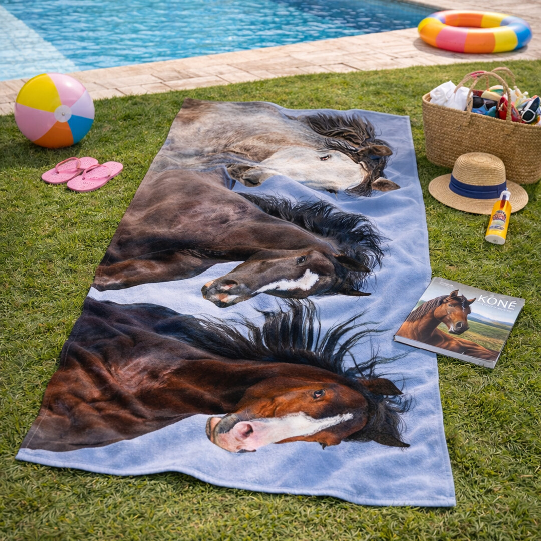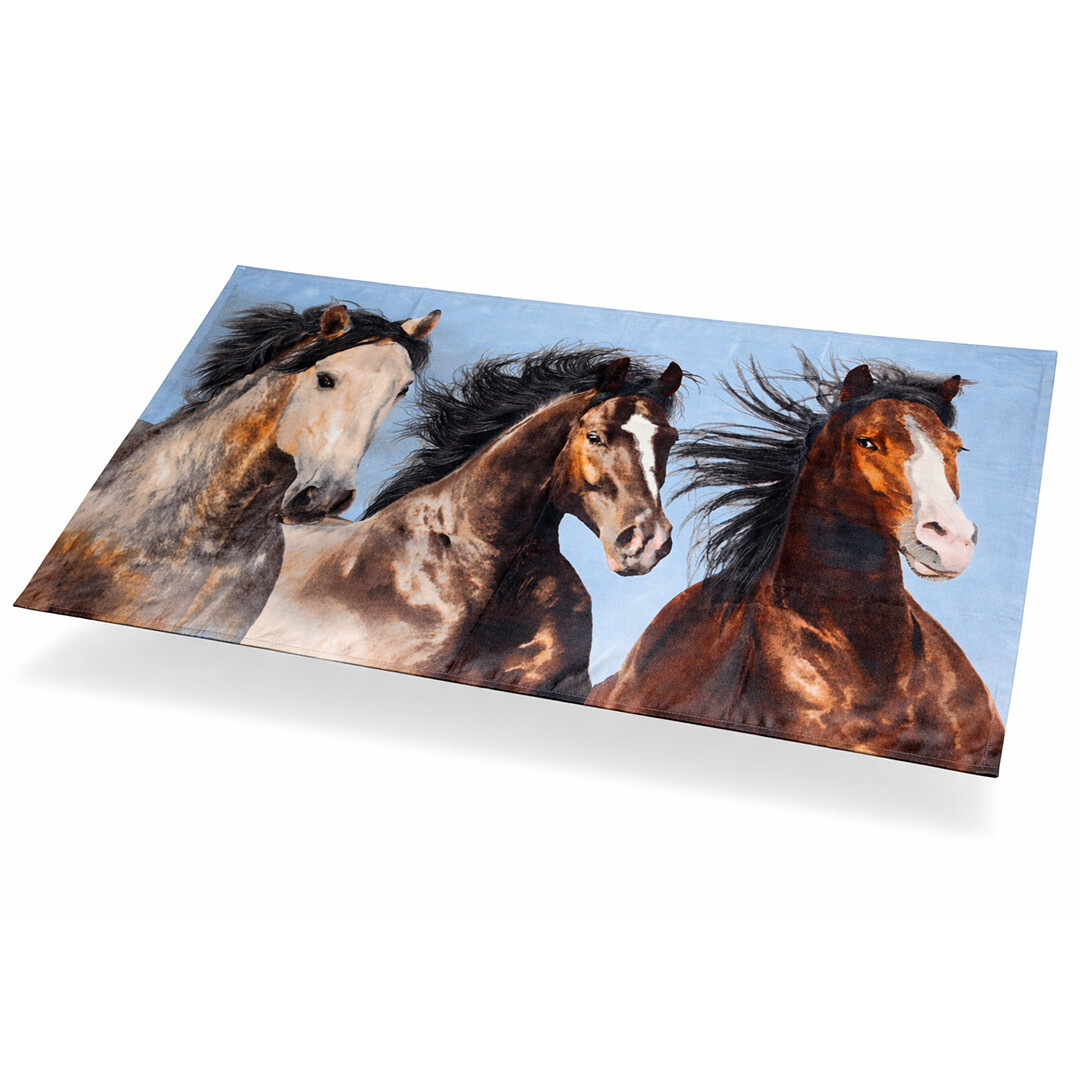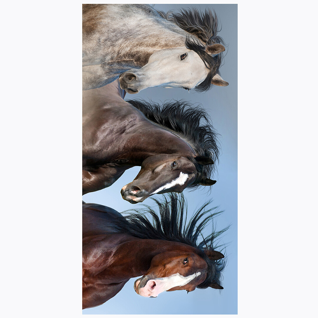 Motiv zachycuje trojici majestátních koní v pohybu, jejichž hřívy vlají ve větru. Každý kůň má odlišné zbarvení – od světlého přes tmavě hnědé až po sytě hnědý odstín – což vytváří působivý kontrast. Detailní zpracování srsti a výraz očí dodávají motivu realistický vzhled. Jemné modré pozadí evokuje otevřenou oblohu a podtrhuje svobodu a sílu těchto nádherných zvířat.