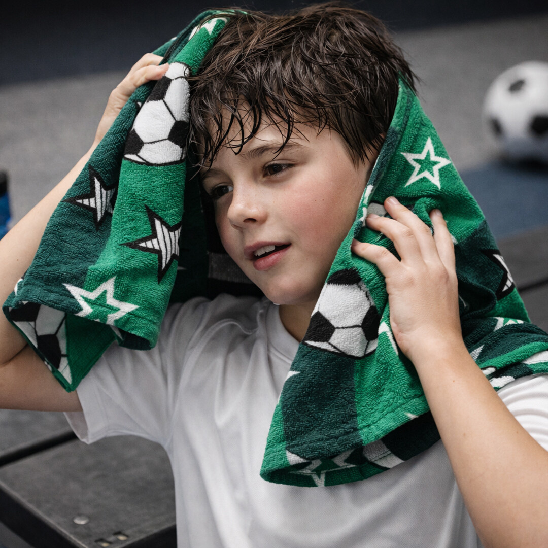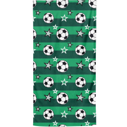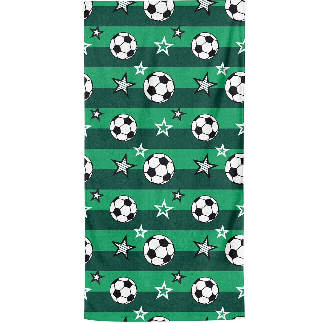 Vzor je inspirován atmosférou fotbalového hřiště. Zelené pruhované pozadí evokuje trávník stadionu a vytváří svěží, sportovní dojem. Celou plochu zdobí pravidelně rozmístěné fotbalové míče doplněné hvězdami v kontrastní bílé a černé barvě. Motiv působí dynamicky, hravě a potěší každého fanouška fotbalu – od malých hráčů až po zapálené sportovní nadšence.