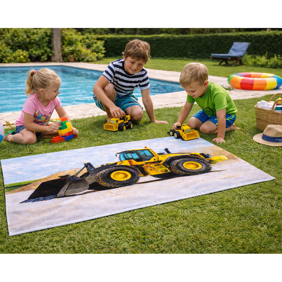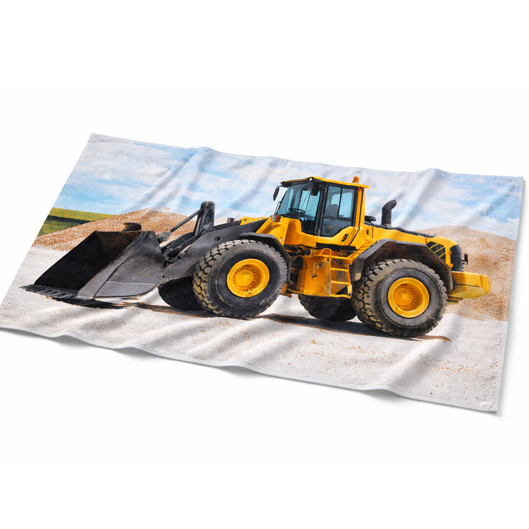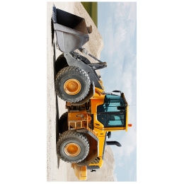 Motiv osušky zachycuje robustní kolový nakladač v detailním bočním pohledu. Výrazná žlutá barva stroje kontrastuje s jemným pozadím světlého štěrku a oblohy, což podtrhuje jeho sílu a stabilitu. Precizně zpracované detaily kabiny, kol i nakládací lžíce dodávají motivu realistický vzhled. Design potěší všechny milovníky stavební techniky a velkých pracovních strojů.