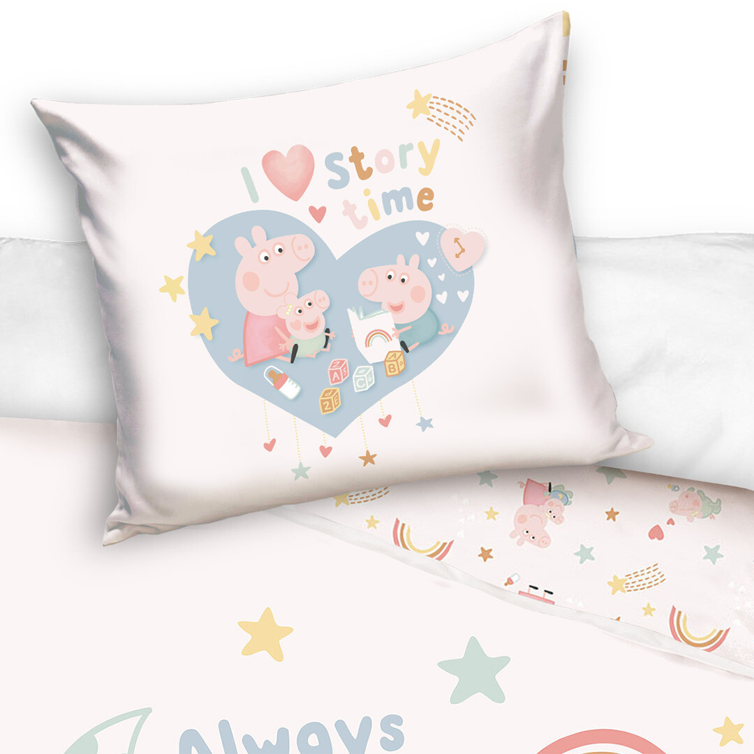 Povlak na polštář je z obou stran stejný a zdobí ho modré srdce s obrázkem Peppy, Evie a Tomíka, jak si spolu hrají. Motiv doplňují drobná srdíčka, hvězdičky, kostky a nápis Story time, který vybízí k večernímu čtení pohádek. Celkový design působí roztomile, klidně a rodinně, takže se děti budou do postýlky těšit každý večer.