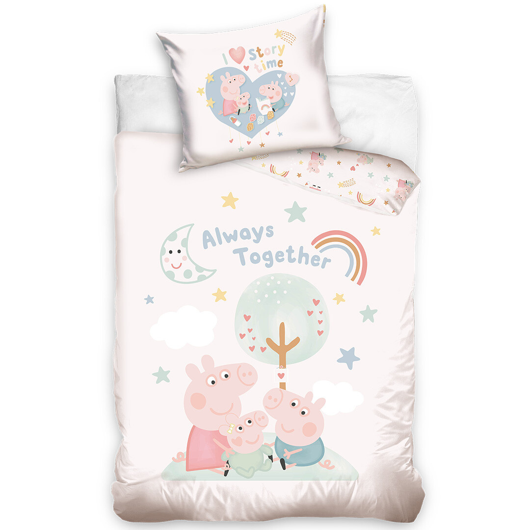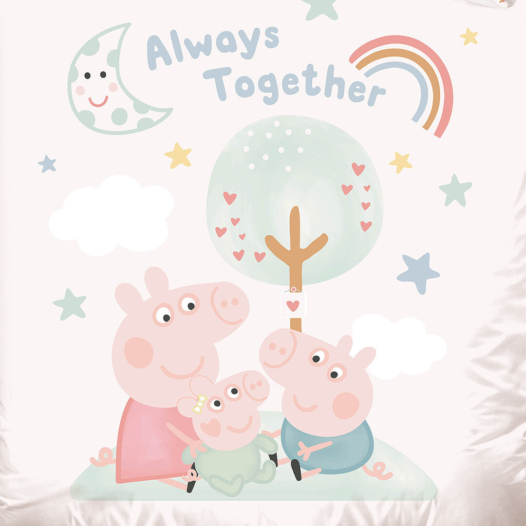Usínání je vždy krásnější, když je celá rodina pohromadě a právě tuto myšlenku povlečení dokonale vystihuje. Lícní strana peřinky zobrazuje Peppu s Tomíkem a Evie, jak si spolu hrají pod stromem pod hvězdnou oblohou a duhou s nápisem Always Together. Jemné barvy, měsíček a hvězdičky vytvářejí klidnou a přívětivou atmosféru.