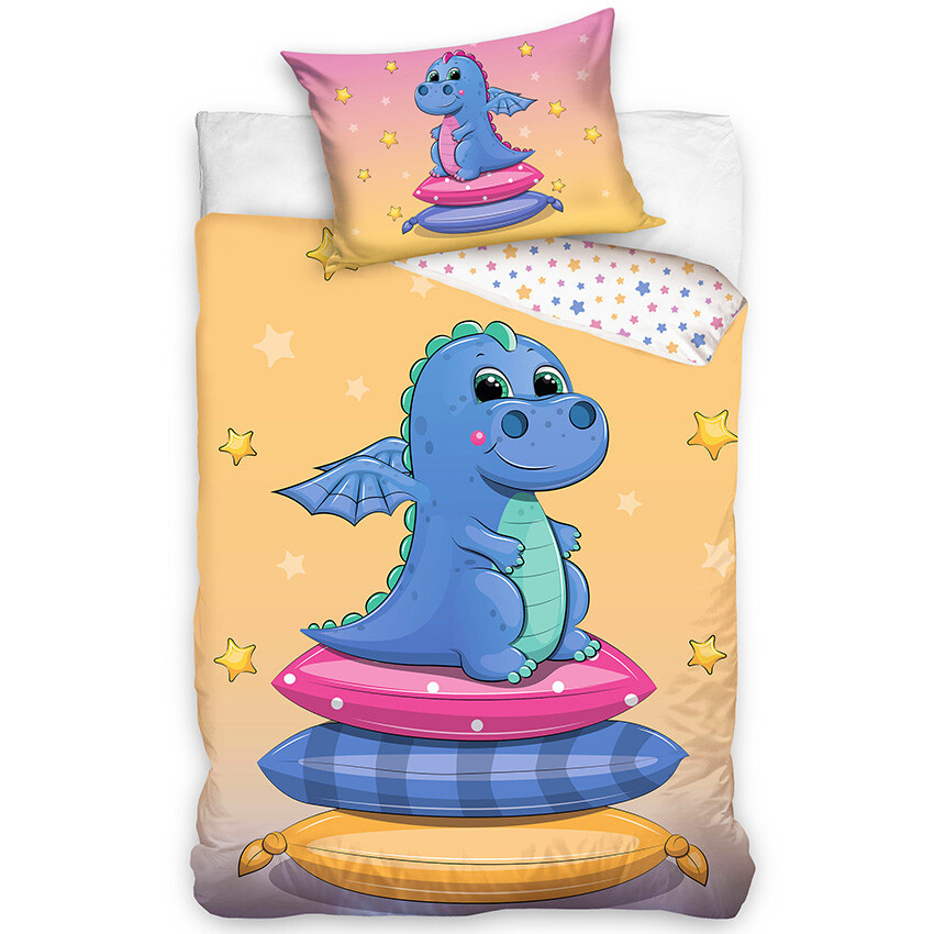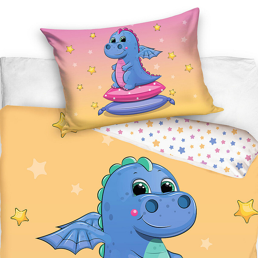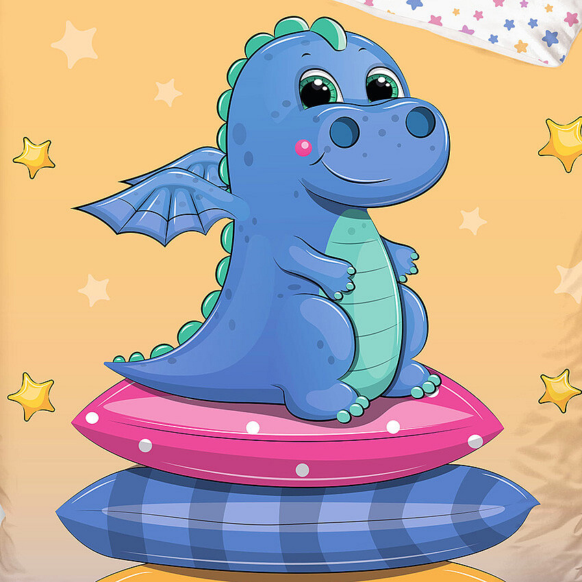 Dominantním motivem je roztomilý modrý dráček s jemným, přátelským výrazem a zavřenýma očima, který spokojeně odpočívá na hromádce měkkých polštářků. Dráček nepůsobí divoce, ale naopak velmi mile a uklidňujícím dojmem – jako malý strážce dětských snů. Jeho oblé tvary, jemné stínování a pastelové barevné ladění vytvářejí pocit bezpečí a něhy.