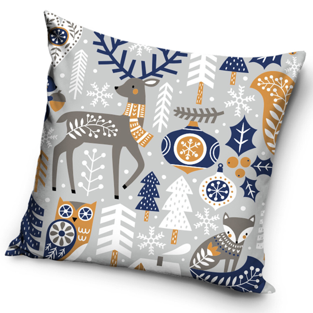 Motiv Polární Pohádka vás přenese do zasněženého severského lesa, kde se potkává sob se zlatým šálem, liška v zimním svetříku a sovička s jemným úsměvem. Mezi nimi se lesknou vánoční ozdoby, stromky, větvičky a sněhové vločky v tónech bílé, šedé, tmavě modré a zlaté. Celý vzor působí hravě, ale zároveň velmi vkusně propojuje přírodní motivy s nádechem elegance a klidu. Polštářek dokonale doplní moderní i tradiční interiér, kde vytvoří útulnou a sváteční atmosféru plnou zimního kouzla.